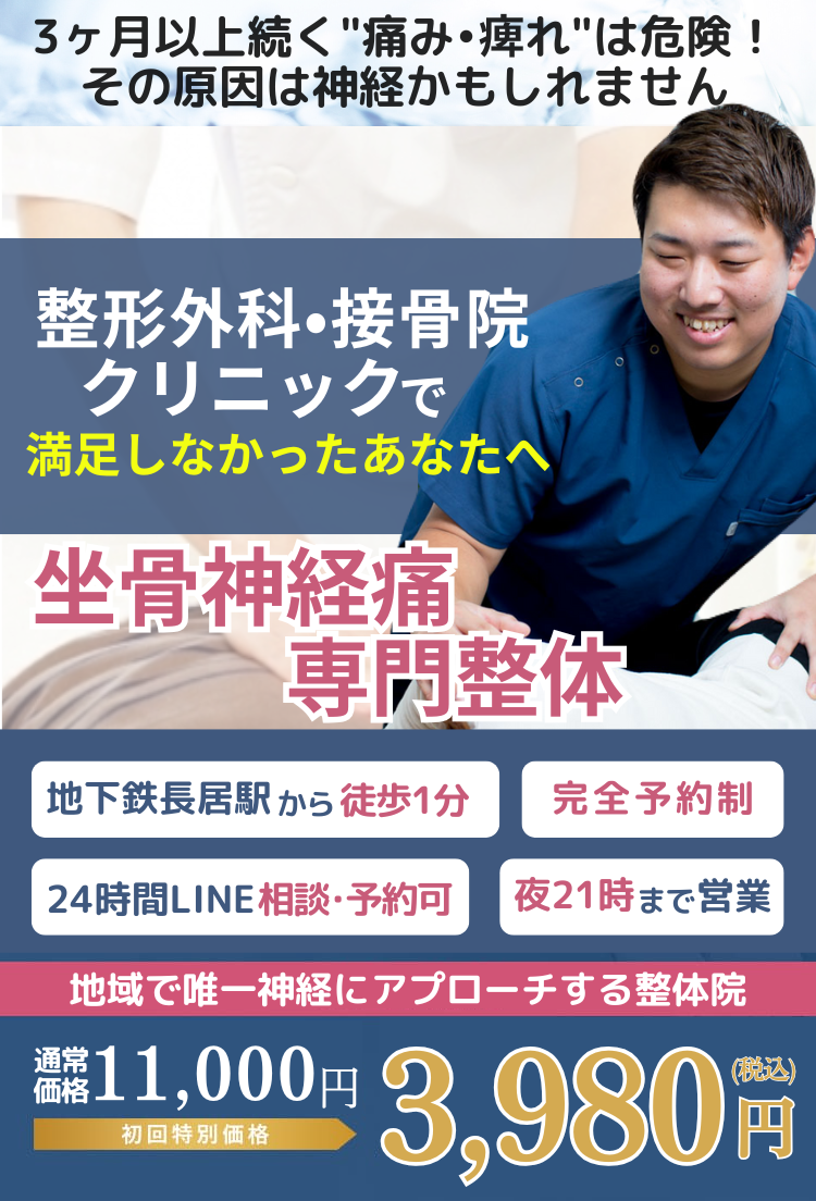当院は坐骨神経痛の原因を神経整体と生活アドバイスで改善し、根本改善を目指す整体院です。