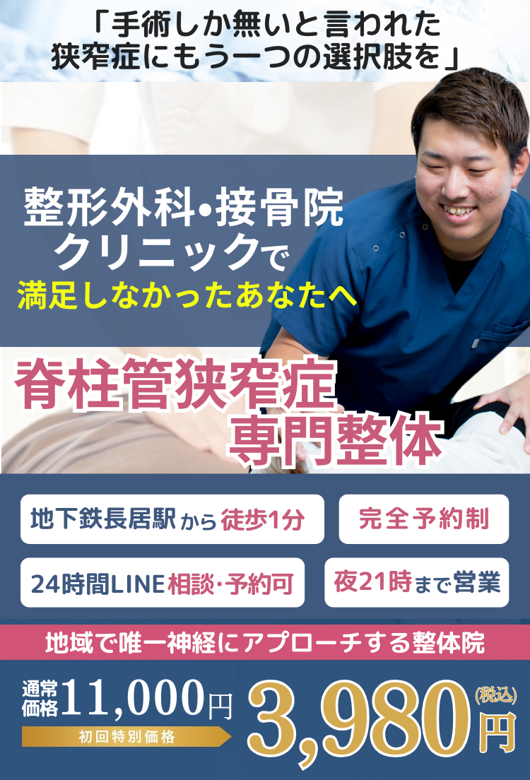 慢性的な腰痛で諦めかけている方や脊柱管狭窄症の手術を勧められている方は、諦める前に「大口神経整体院」にお問い合わせください。