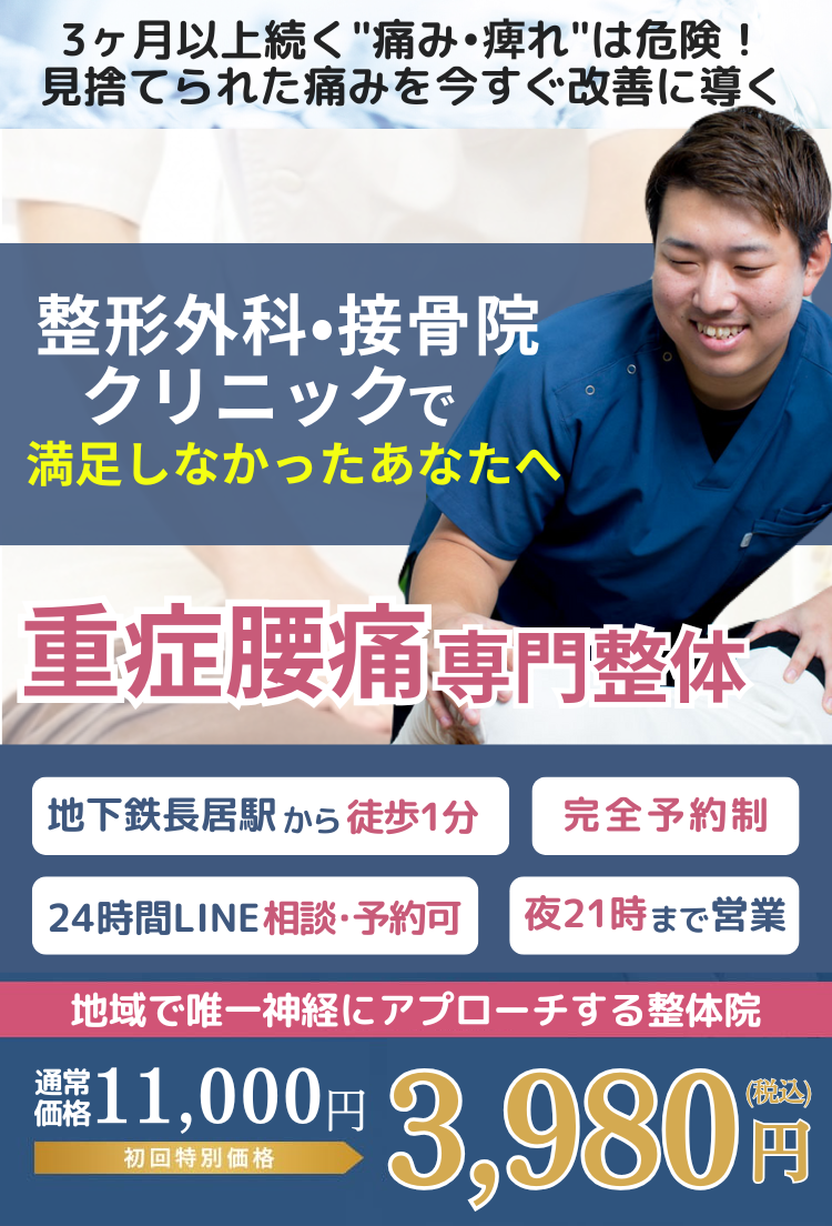 整形外科や接骨院で腰痛が改善しない方には、大阪市住吉区長居駅前の重症症状専門「大口神経整体院」の施術がお勧めです。