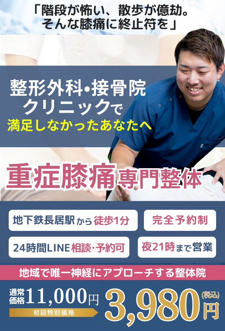 身体のゆがみや膝への負担が大きい生活を送っている方は、大阪市の「大口神経整体院」をご利用ください。